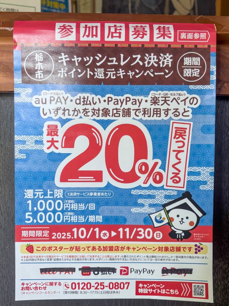 栃木市キャッシュレス決済 ポイント還元キャンペーン(2025 10/1〜11/30)※当店はPayPayのみ
