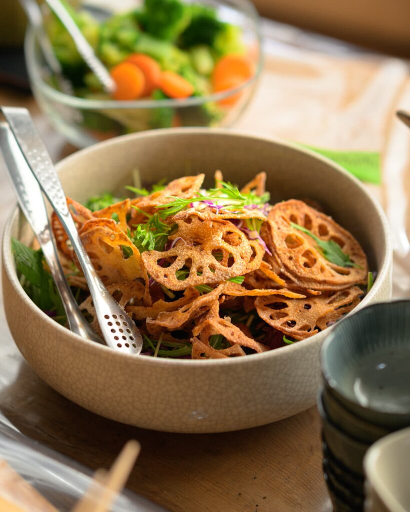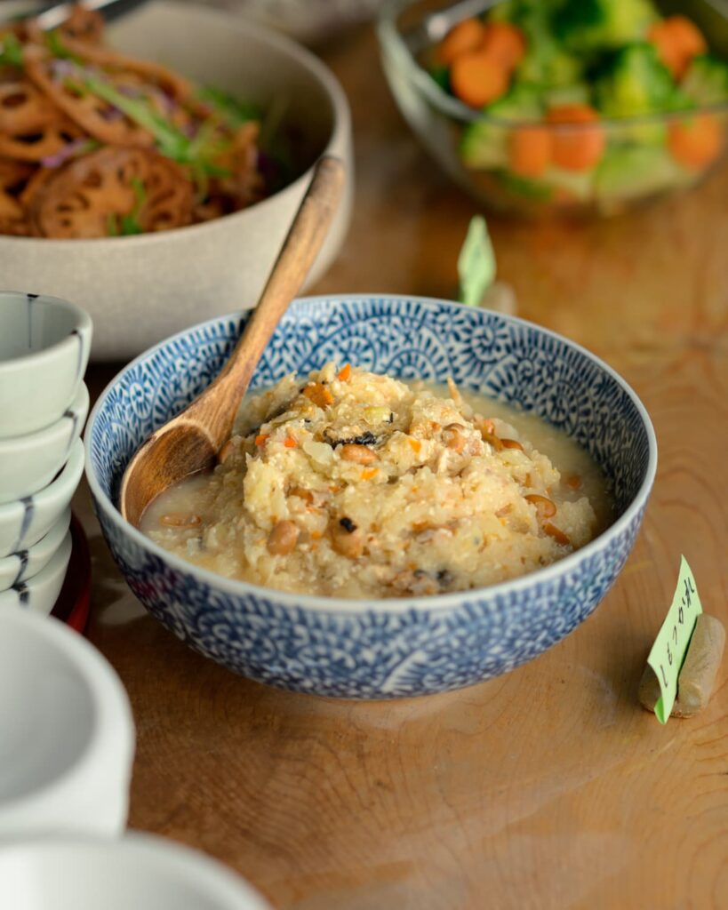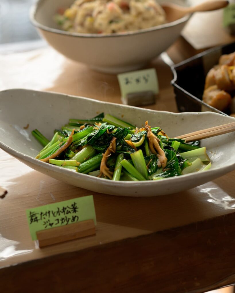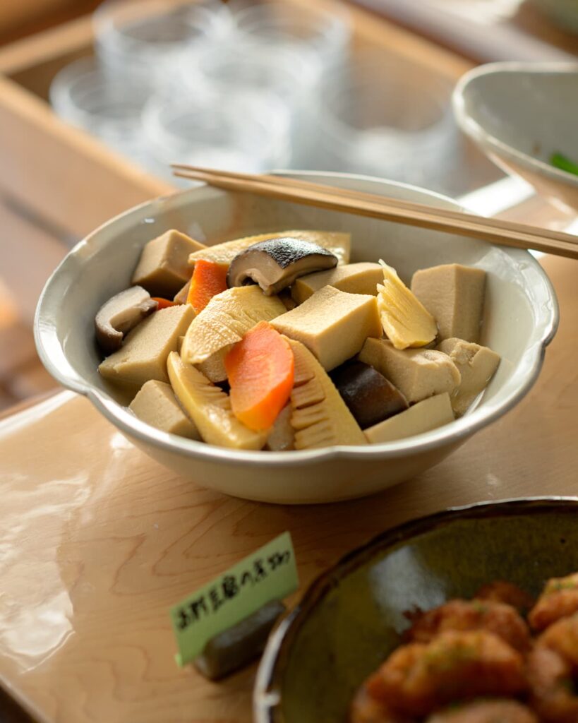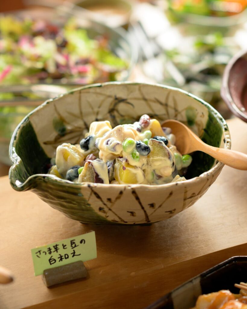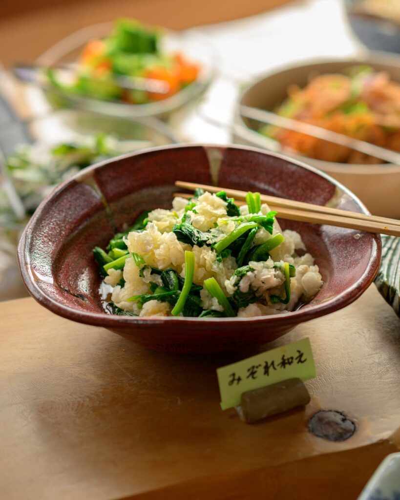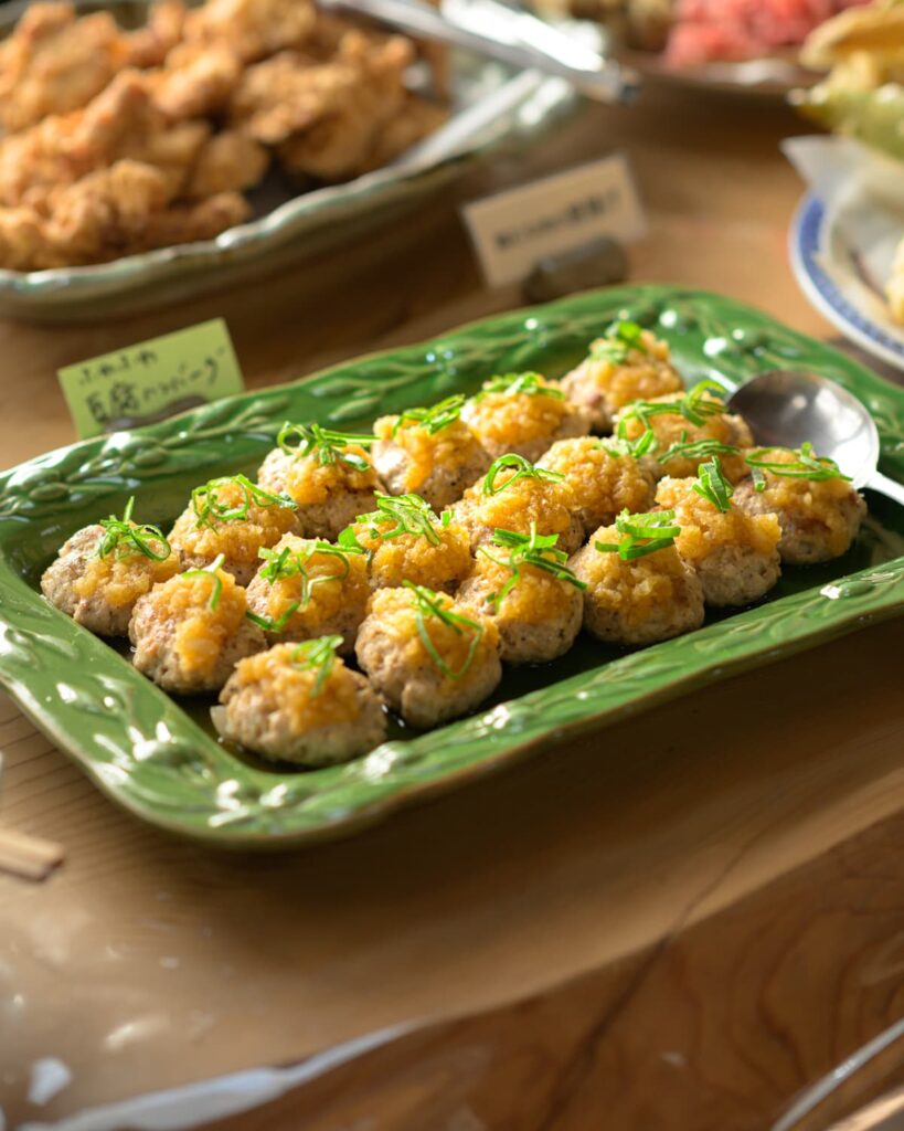 宮ネギの一本揚げ/ふわふわ豆腐ハンバーグ/パリパリレンコンサラダ/みぞれ和え/まいたけと小松菜ジャコ炒め/さつまいもと豆の白和え/高野豆腐の煮物/しもつかれ/ふろふき大根 ほか